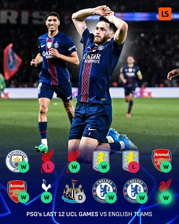 数据统计显示,巴黎在欧冠最近12次对阵英超球队,豪取9胜1平2负。